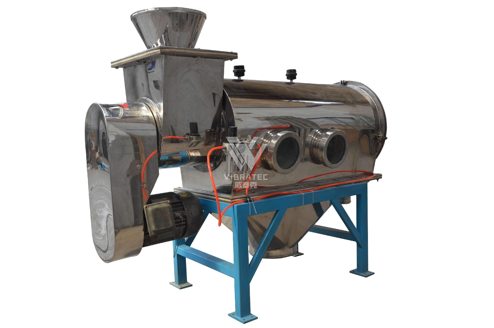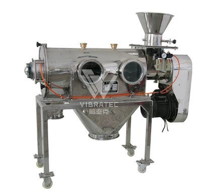 WQS气流筛的筛网为圆筒状,置于机体内,物料通过螺旋输送系统后,与气流混合、雾化进入网筒内,通过网筒内风轮叶片的高速旋转使物料同时受离心力和旋风推进力,从而使物料喷射过网,过网的物料由细料出料口排出,不能过网的物料沿网筒壁从粗料出料口排出,达到快速分离的目的。